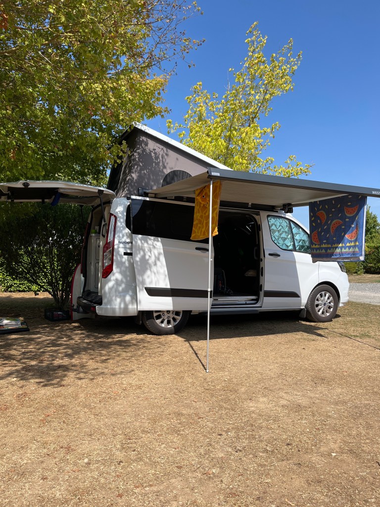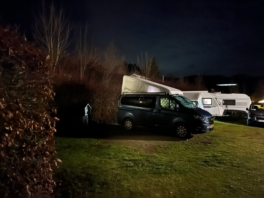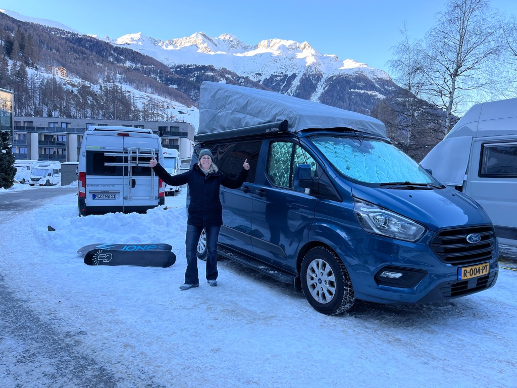 Met koude tenen vraag ik me af waar mensen die spullen toch allemaal laten. Wij hebben al best een uitdaging met zijn tweeën met alle skikleding in de camper, de badjassen liggen op een hoopje tussen de voorstoelen en de handdoeken zijn creatief gedrapeerd over relinkjes en lampjes. Voor zachte dekentjes en kussentjes is echt geen plek! Volgend jaar dan toch maar die privé badkamer? Zul je zien dat we dan weer iets anders missen. Een handdoek-cape bijvoorbeeld… Echte pro’s hebben immers toch altijd een handdoek meer. 😉
