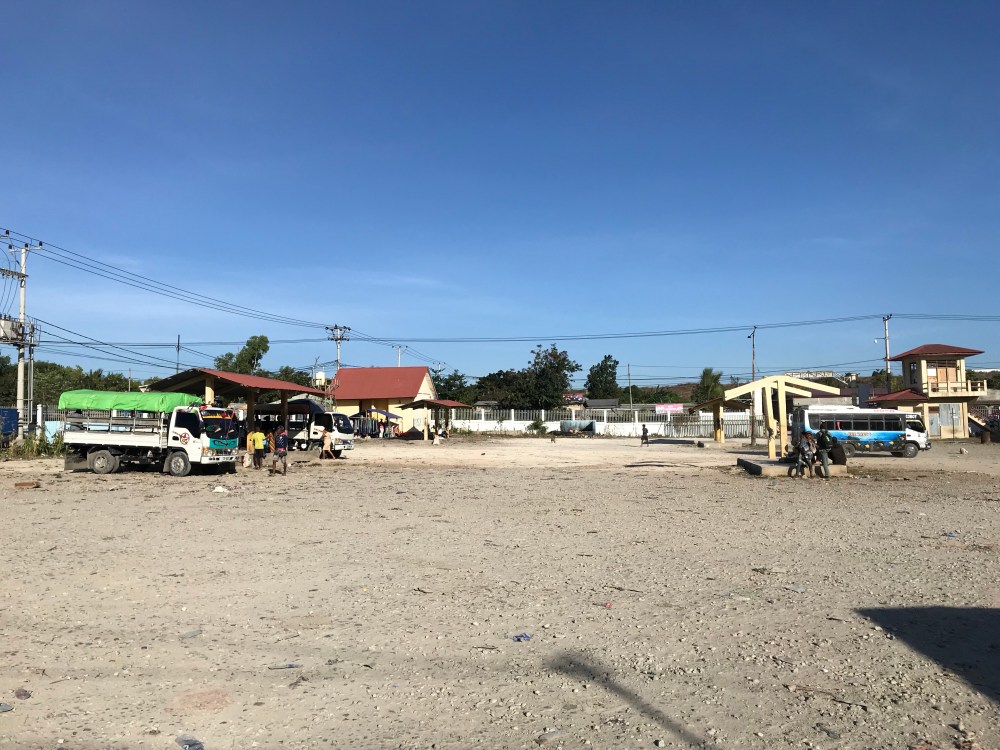 Op dag 3 verlaten we dus vol goede moed ons guesthouse op weg naar Lospalos. Uit de interactie met de eigenaresse hebben we kunnen opmaken dat we naar het busstation moeten voor de bus naar Lospalos. We nemen een microlet (soort kleine bestelbus met bankjes waar ongeveer 10 mensen in kunnen) en komen aan op een (wederom) verlaten terrein.