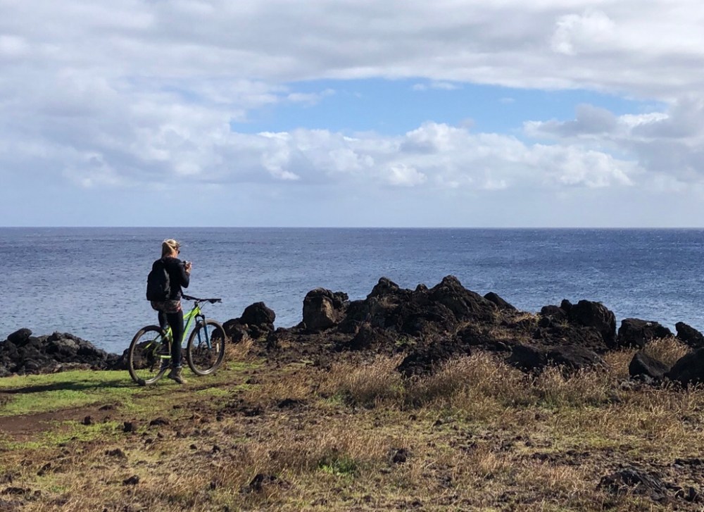 We brengen de dagen dus door met het bezoeken van de verschillende elementen van de rijke geschiedenis. We mountainbiken langs grotten die men gebruikte om te schuilen tijdens de oorlogen, we rijden langs de verschillende platformen waar de moai nog overeind staan en wandelen over de flanken van de vulkaan die eigenlijk gewoon een hele grote werkplaats is. En tussendoor lopen we heen en weer door het straatje, langs de souvenirwinkeltjes en de lege restaurants (want laagseizoen) en proberen we ons zo goed mogelijk aan te passen aan de verschillende seizoenen die we op 1 dag zien (zo gaan we inmiddels moeiteloos van lange broek en donsjack naar bikini/zwembroek en zijn we zelfs wezen snorkelen!).